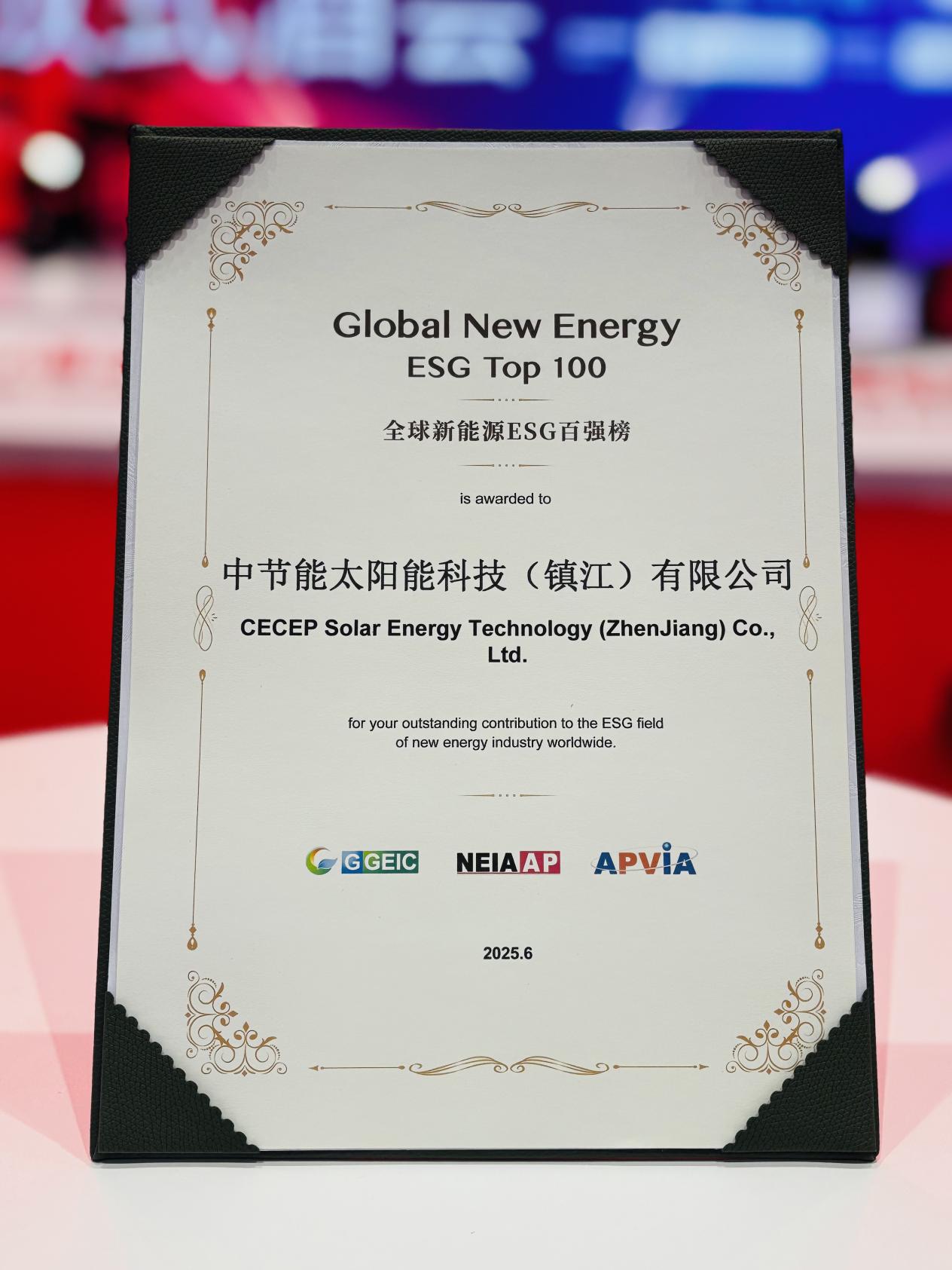 近(jin)日(ri),在(zai)上海舉(ju)行(xing)的(de)第十八屆SNEC光(guang)伏(fu)展(zhan)期(qi)間,太(tai)陽能鎮江公司憑(ping)借在(zai)環(huan)境、社會及治理領域的(de)扎(zha)實實踐與積(ji)極成(cheng)效,成(cheng)功(gong)入選(xuan)“Global New Energy ESG Top 100全(quan)球新能源(yuan)ESG百(bai)強(qiang)榜”,其可持續發展(zhan)努(nu)力(li)獲得國際(ji)權威機(ji)構高度認可。